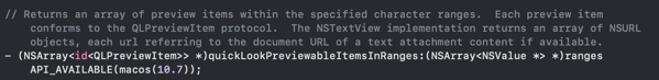 So, why does this happen? QLPreviewPanel is a subclass of NSPanel4, which is a very weird subclass of NSWindow that has a bunch of interesting behaviors (a topic for another day). An app has a single shared QLPreviewPanel instance, and you can use a class that conforms to QLPreviewPanelDataSource to provide it with your preview item(s). However, out-of-the-box, QLPreviewPanel traverses the app's Responder Chain to find an object that can control it. As it turns out, NSTextView has the private quickLookPreviewableItemsInRanges: method, which overrides whatever you're trying to set the QuickLook panel to, as long as an NSTextView is in focus.